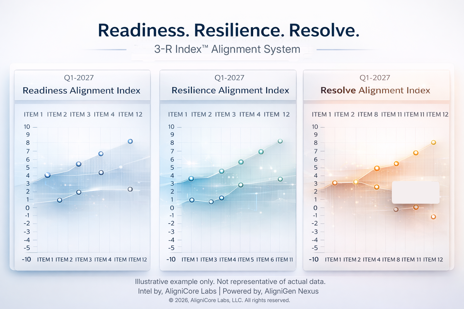 AligniCore’s→ 3-R Core Alignment Idex™ is a proprietary computation table framework that calibrates structured assessment data into indexed measures of Readiness, Resilience, and Resolve from mid to apex-stake organizations and units operating within high-pressure, mission-critical environments.